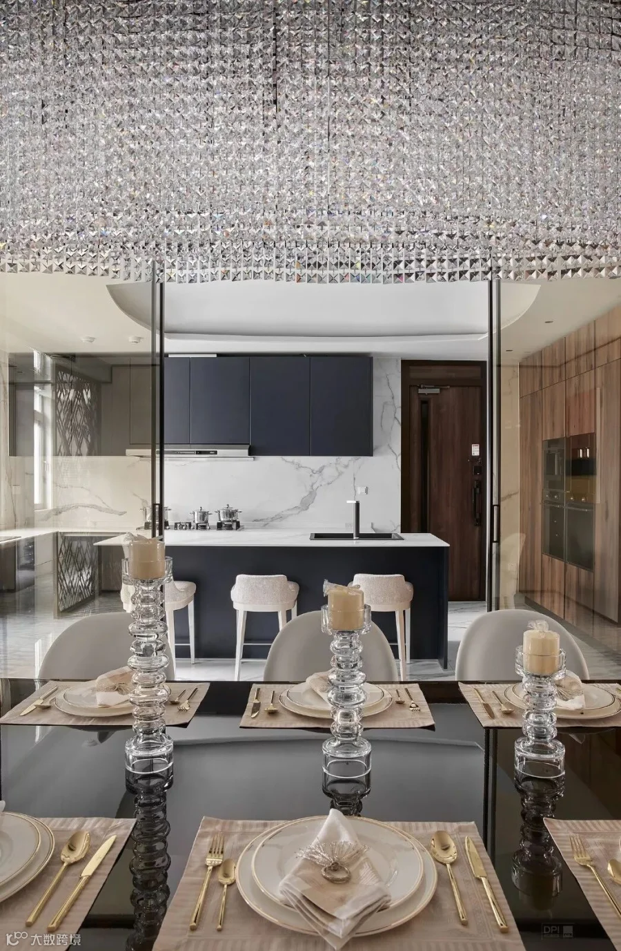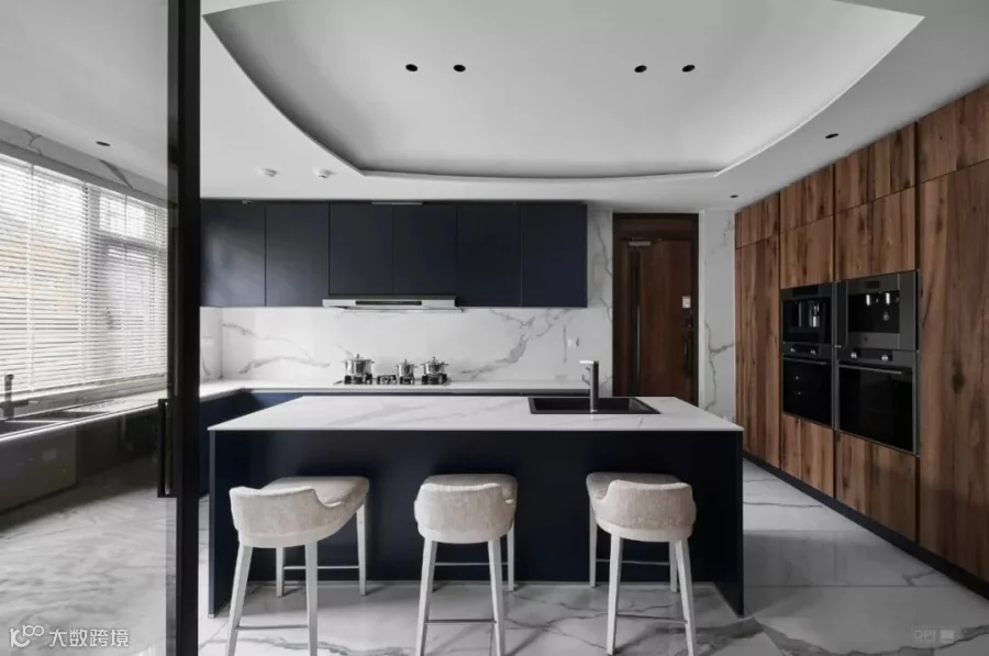 室外光线流泻进来,衬出大理石自然的肌理,磨砂深灰的橱柜活跃着气氛,勾勒出独有的高贵气息,让用餐变成一件愉快又优雅的事。