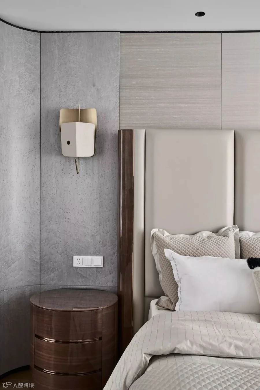倾斜的阳光下,米色调的轻暖,褐色调的质感,再巧妙搭配布艺质感的燕麦色背景墙,细节之处亦是尽善尽美,有一种默契和互动关系在其间酝酿,让置身于其中的人感受温暖和谐。