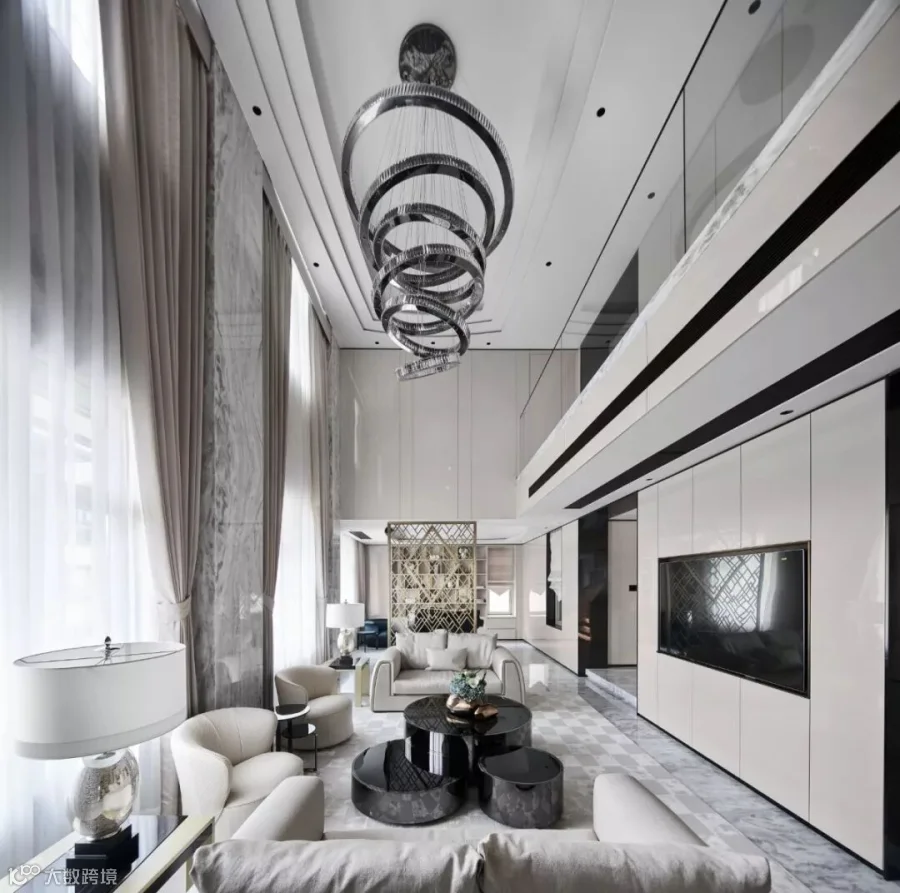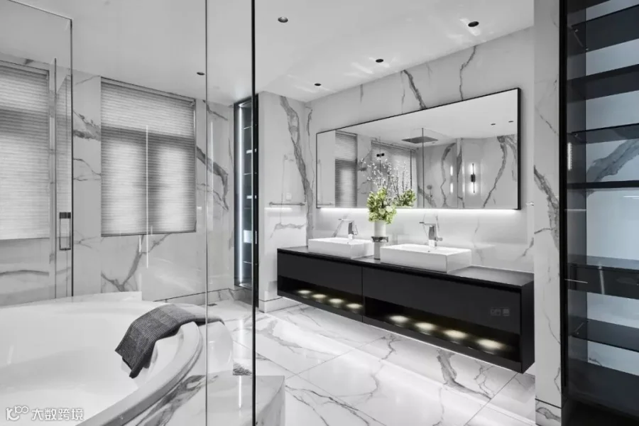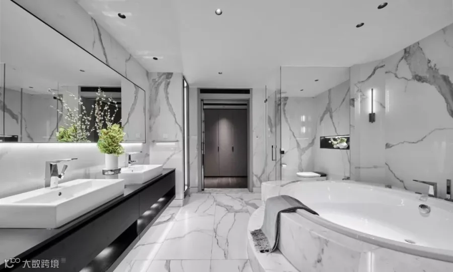 作品选用意大利REX瓷砖特级雪花白,产品源自卡拉卡塔山最经典的黑白组合石纹,高贵的白色与纯正的黑色,让黑白组合变得极致和永恒,将优雅、奢华的现代美学演绎得淋漓尽致,赋予空间独一无二的艺术范式。