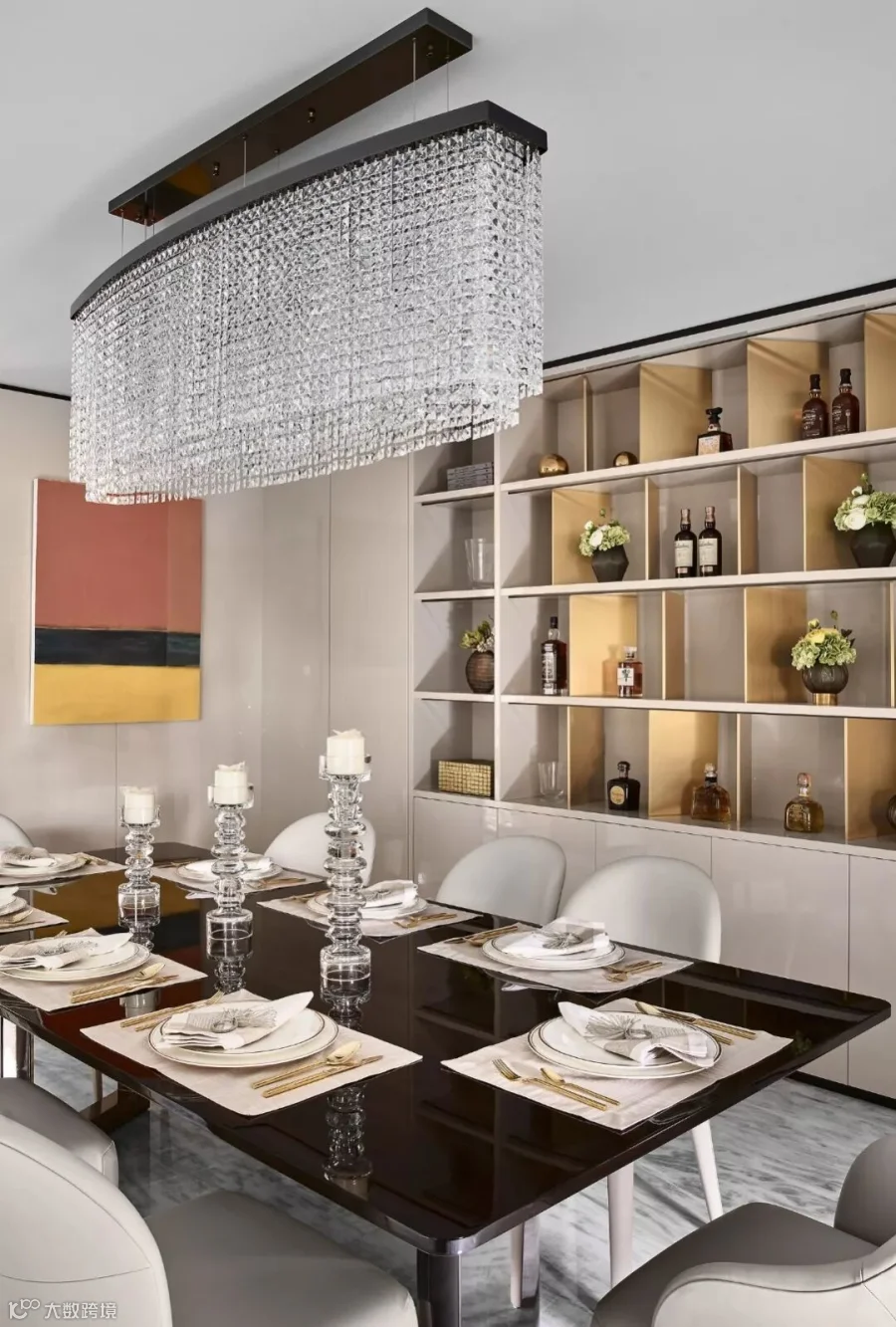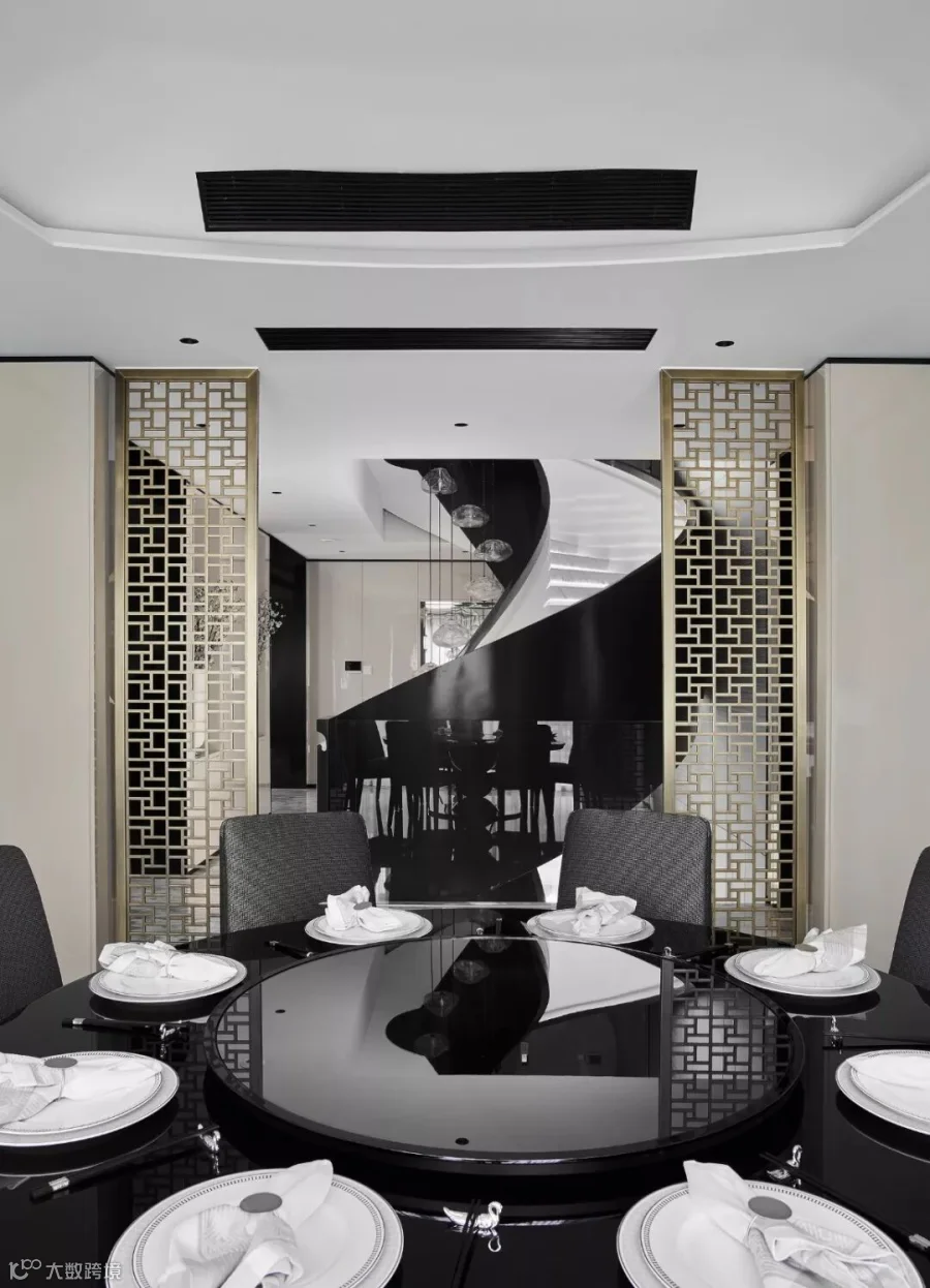 圆形餐桌带来的浑厚,黑色与金色带来的强烈视觉观感,如同跳动的光晕,黑白与亮丽的色彩不谋而合,打造的不仅是奢华,更是一种永恒经典与贵族气质的品质生活。