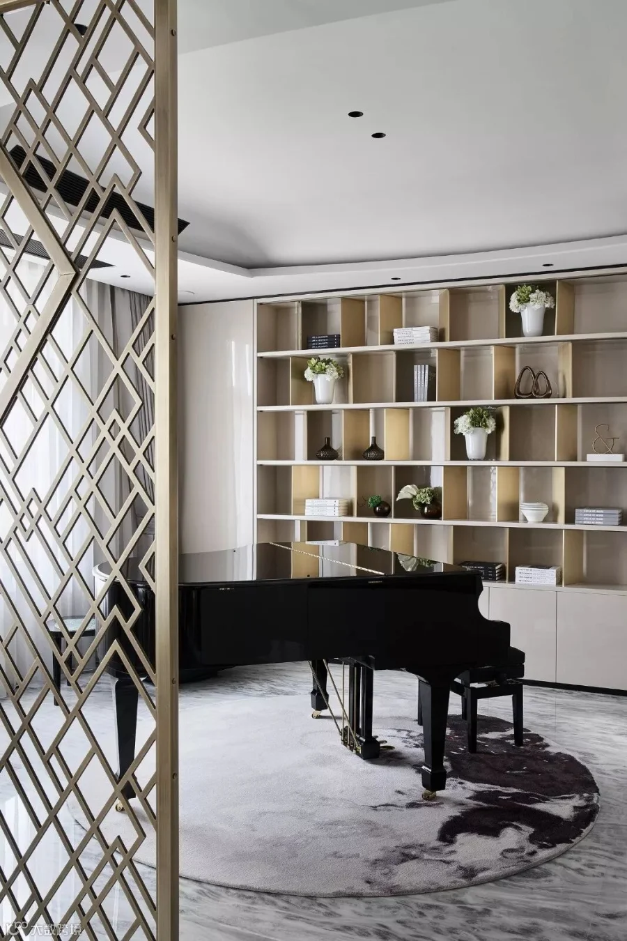 那黑色音符,就这样一个个在晕染开来的地毯上、金属质感的隔屏上慢慢地跃然而上,在暖意的光线中折射出一种隐藏的贵族气质。