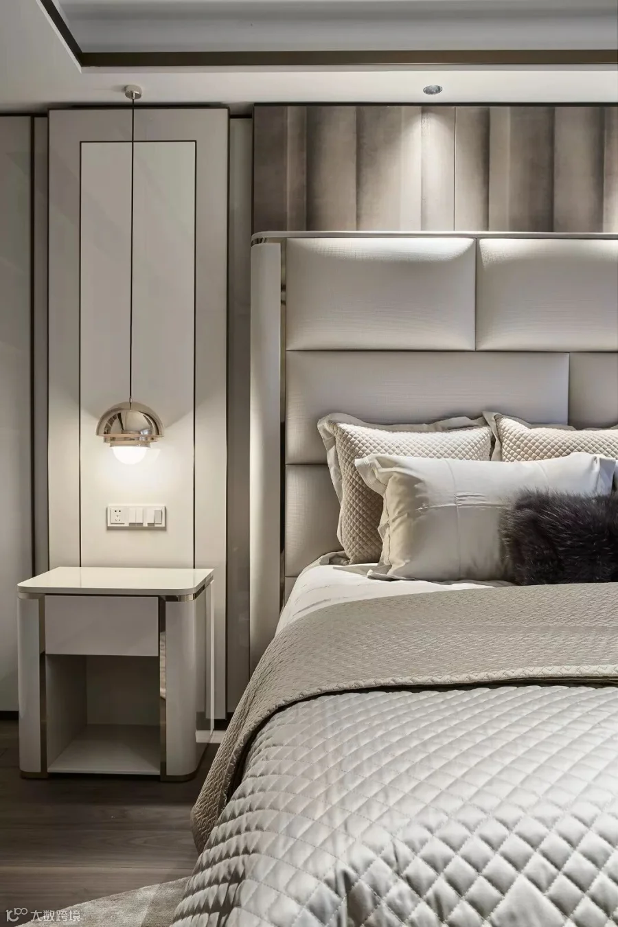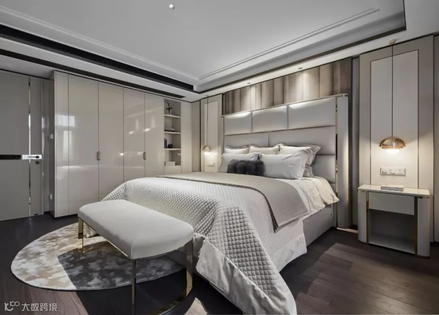 拾级而上的是主卧,整体空间用燕麦色与烟霭色作为主色调,点缀着金属感的流动线条,暖色的灯带来明与暗、光与影的效果,给室内空间披上一件柔和的外衣,使空间更具透气简洁,打造平和静谧的居所,芝兰之室,蓬生麻中。