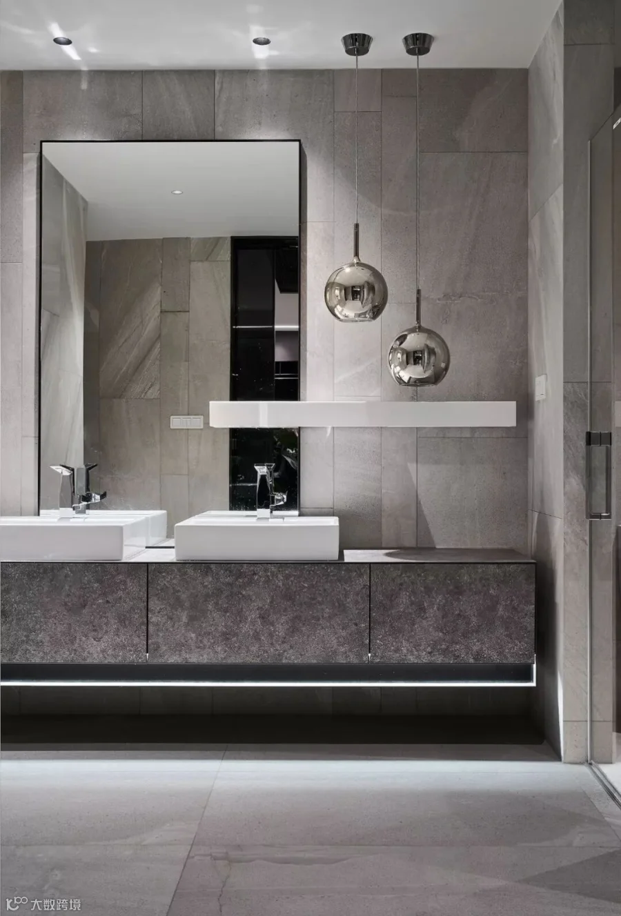 主卫对话着简约冷冽的大理石,各个功能区运用大面积透明的玻璃合理地划分开来,洗漱台大分块的设计、柜体小分块的分割,点、线、面的完美结合,丰富了空间的艺术形态但又保持着最本真的生活需求。