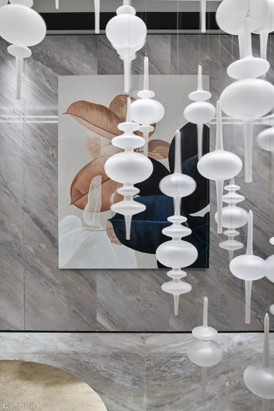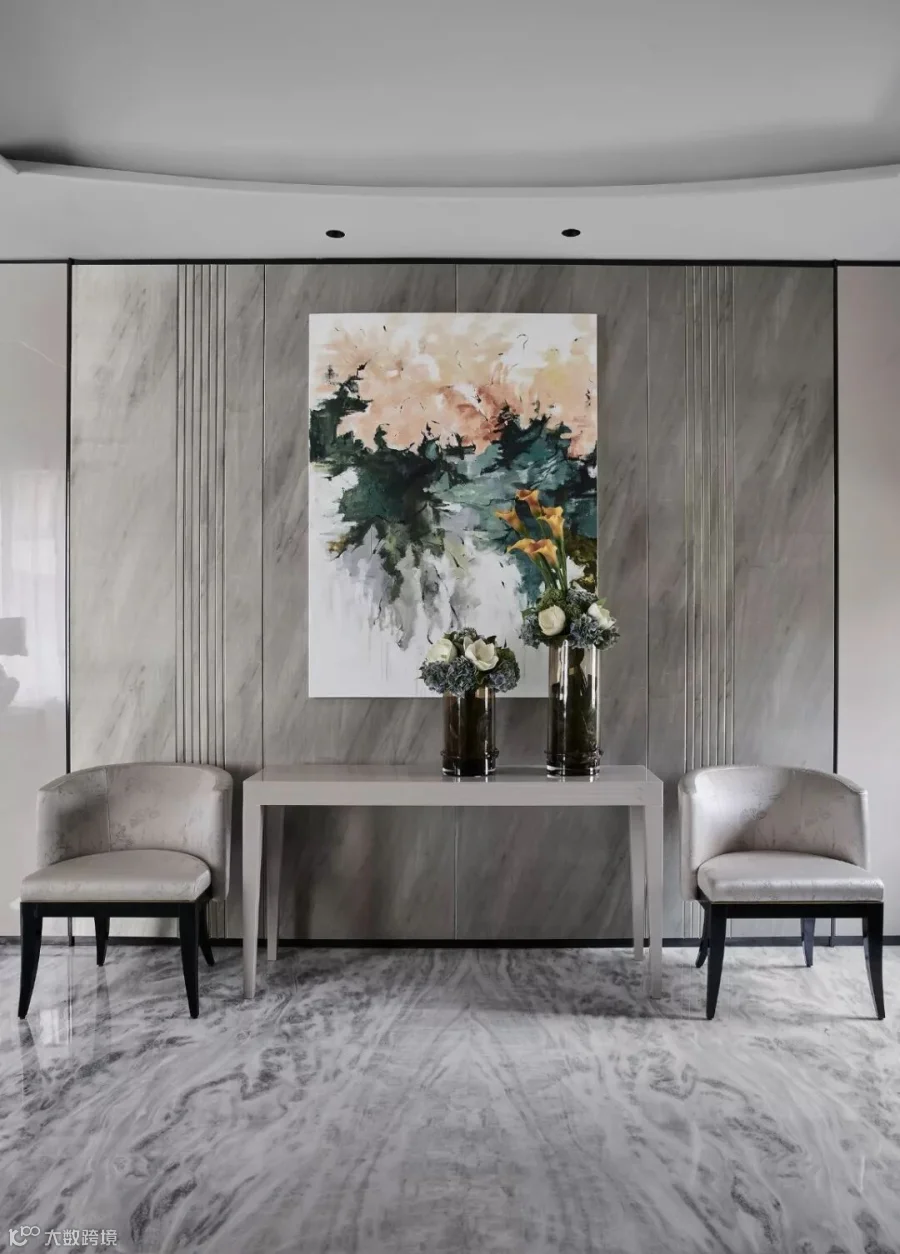 前厅进门(这是原先单套的客厅位置),映入眼帘的是一幅色彩变幻的抽象艺术画,高雅大气的花卉在其间若隐若现地浮动起来,延伸开来的是时而大面积分布、时而细腻如丝的大理石灰地面,将对称性、平衡性与现代审美的创新性融入其中,展现着一场纯粹的人与空间之间的灵魂对话。