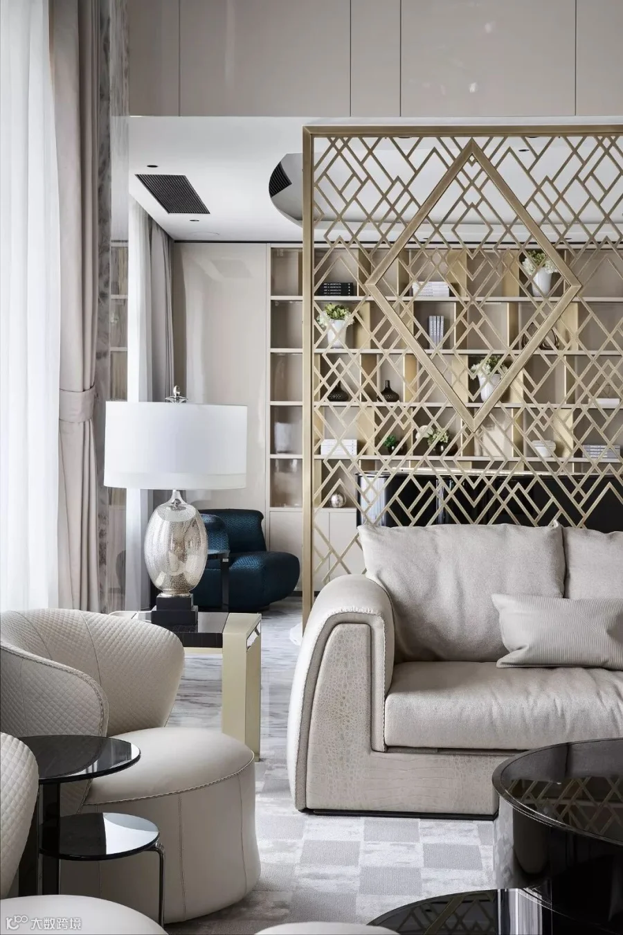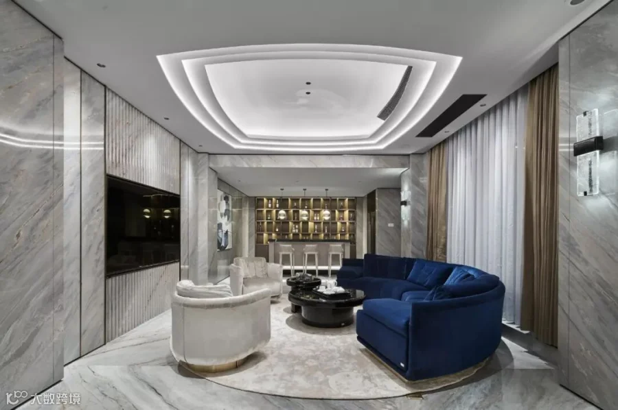 随之进入客厅(这是原先两套个自的门厅位置),中空挑高的设计带来绝佳的视觉感官,落地窗承接着阳光的洗礼,极具流动线条感的大理石墙面,使整个空间干净简洁,呈现出隽永典雅的风格。米色系的多人沙发和窗帘,黑曜石般的角几和茶几,在自然光线的映射下产生链接,注入格纹状的浅色系地毯,诠释着极致奢华的当代风格。