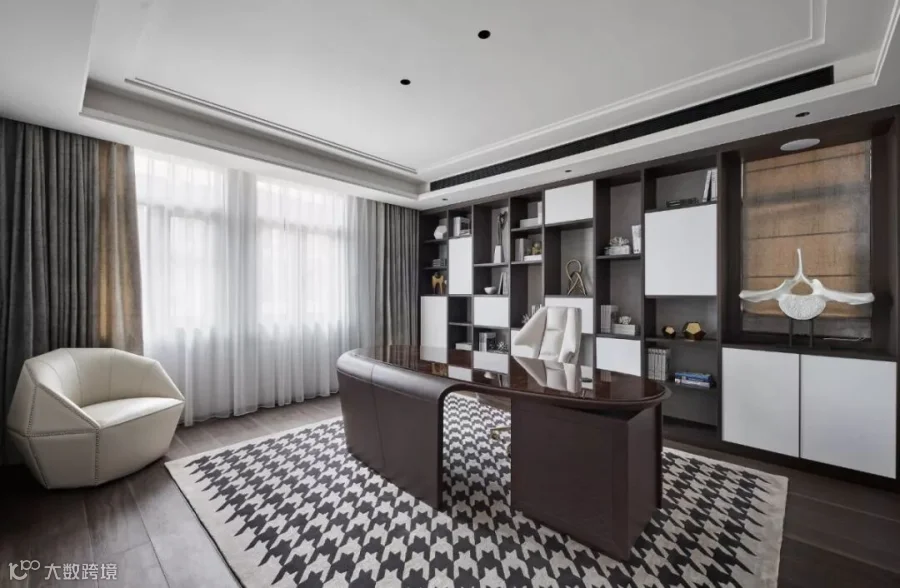 书籍与生活有着千丝万缕的关系,在书房的设计中,书柜对话着横竖穿插的板材,它们互相咬合,形成墙面肌理,白色和褐色二色,将高雅和厚重交相辉映在一起。