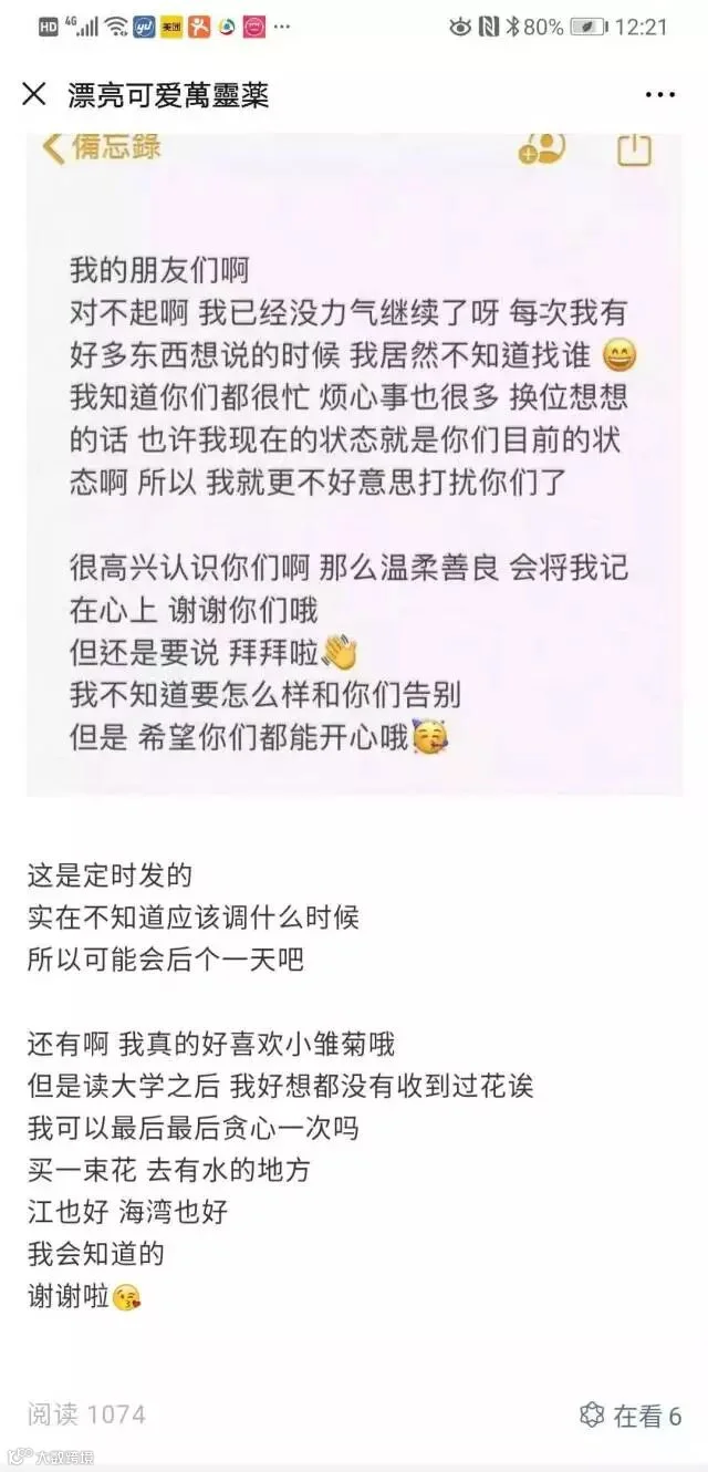 据李某秀的同学反映,李某秀的个人公众号于今日发送了一条定时推送,推文中出现“自杀”“已经没有力气继续”等字眼。