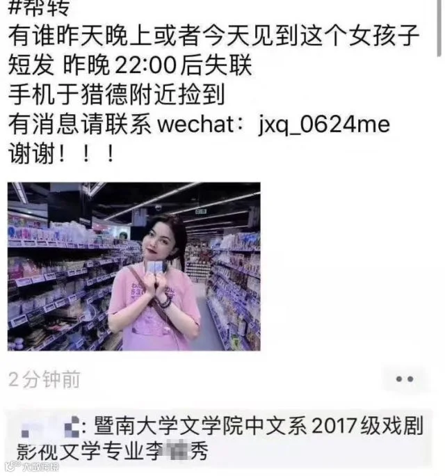 10月22日22时左右,暨南大学文学院中文系2017级戏剧影视文学专业学生李某秀在离开校园后失联。其同学表示,李某秀在离开校园时曾在微信上联系舍友帮忙留门,但彻夜未归。学校老师在今日上午接到警方电话,称李某秀的手机和鞋子于珠江边被环卫工人拾得。