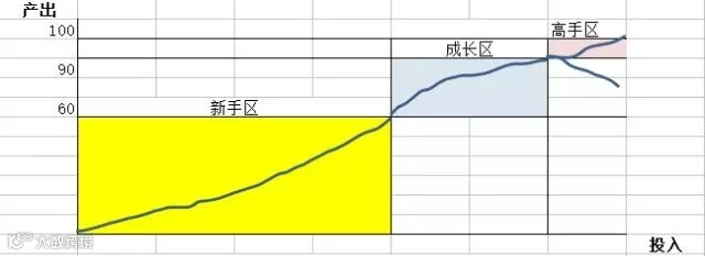 按照努力和回报的关系,我们划分为三个区间,分别为新手区、成长区和高手区。