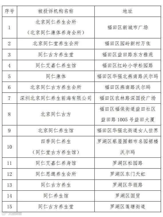 具体被投诉机构名单(由消费者提供的名称及地址)如下: