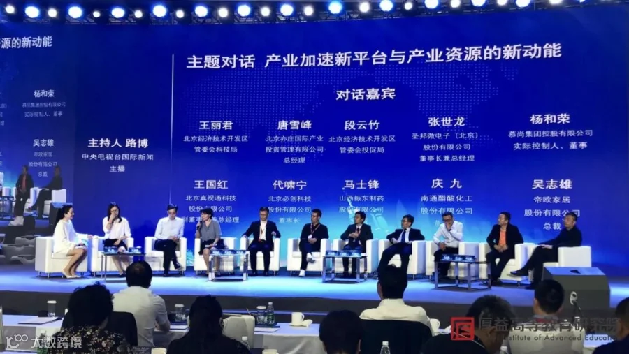主题对话环节十位来自政府和企业家的嘉宾就《产业加速新平台与产业资源新动能》的话题做了深入讨论,对话由后E同学、中央电视台国际频道新闻主播路博主持。