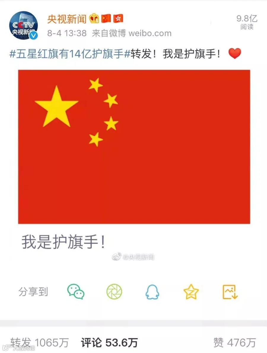 在香港近期发生的暴力行径中,激进分子多次将国旗丢入海中,侮辱国旗,引发全国人民的极大愤慨,许多爱国爱港人士也纷纷谴责。8月4日,央视新闻在新媒体平台发起话题#五星红旗有14亿护旗手# ,连续多日占据热搜话题榜榜首。