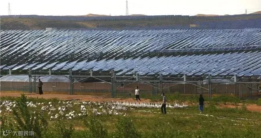 库布齐沙漠分布着数以万计的光伏板,“板上发电,板下养羊,板间种草”。在这里,光伏板提供清洁能源;光伏板之间铺设着喷灌系统,栽植着甘草、苜蓿、沙打旺、杨柴等牧草,防风固沙,一举多得;光伏板下养殖优质绵羊和灰雁等畜禽,构成了立体生态产业体系。