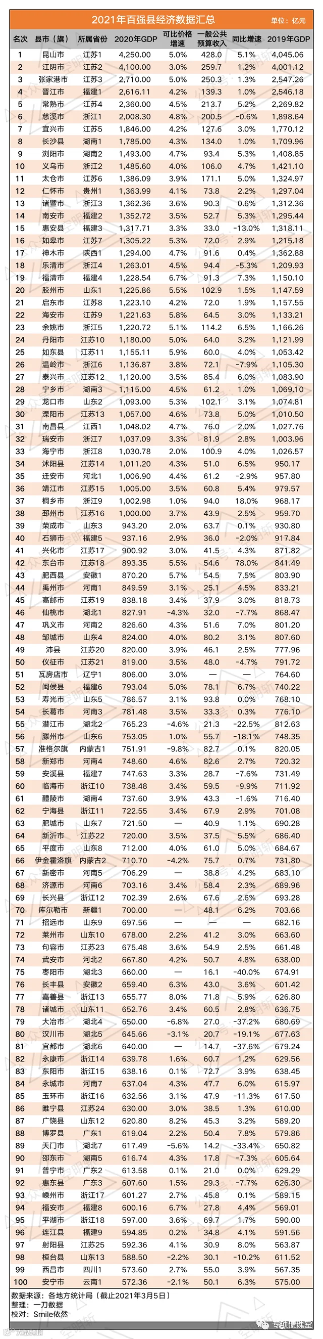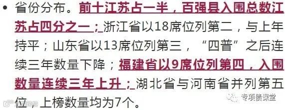 导读:2021年百强县榜单正式发布,昆山市连续17年位列榜首,晋江市为前五名唯一非江苏县(市)。省份分布方面,江苏、浙江、山东分列前三位,其中“苏大强”以25个席位领跑!区域分布方面,东部地区占比高达70%。快看看你的家乡上榜了吗?