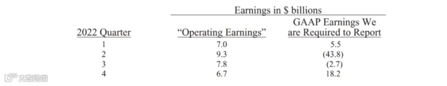 伯克希尔在2022年表现不错。公司调整后的营业利润(operating earnings)——我们使用公认会计原则(“GAAP”),不包括持有股票的资本利得——创下了308亿美元的历史新高。查理和我专注于这个实际数字,并建议你也这样做。不过,如果没有我们的调整,GAAP数据在每个报告日都会剧烈波动。请注意它在2022年的波动,这并不罕见: