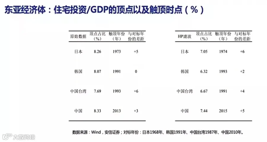 按照这样的方法,我们进一步对比东亚邻国的经济体的住宅投资相对GDP而言是什么时候见顶的,以及中国大概在什么时候见顶。