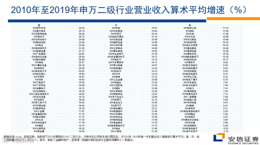 计算完这些长期增速以后,我们把长期增速从高到低做一个排序,这一排序在颗粒度上,我们精确到二级细分行业。所谓的二级细分行业,就是在一级行业的基础上再下沉一层。