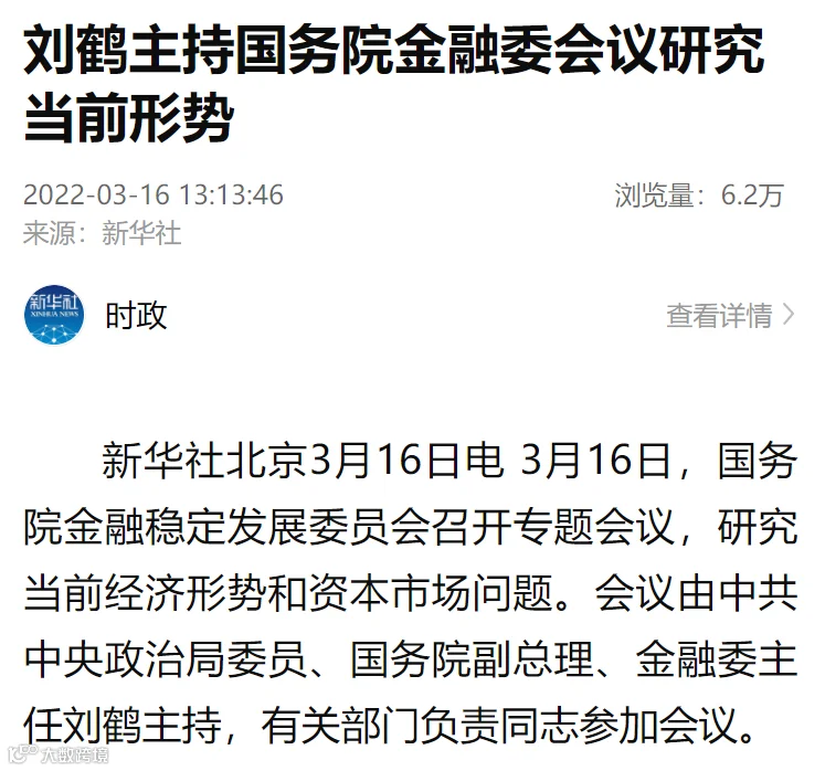 3月16日,国务院金融稳定发展委员会召开专题会议,研究当前经济形势和资本市场问题。会议由中共中央政治局委员、国务院副总理、金融委主任刘鹤主持,有关部门负责同志参加会议。