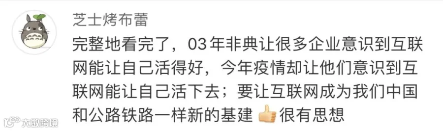 马云:我们做任何事情既要尊重昨天,要珍惜今天,更要为未来做准备。如果不为未来做准备,我们不可能在1月20日就成立抗疫小组,不可能26日就成立全球采购小组;如果不为未来去思考,就不会有今天的阿里巴巴,在二十年以前做电商;如果今天不为未来考虑,我们这公司未来怎么可能生存?我们的国家不为未来去考虑,怎么可能成为一个在世界受人尊重的国家?所以我们珍惜未来,尊重未来,必须为未来做事情。国内国外有各种不同的声音,正因为有不同的声音,才需要你用自己的脑袋去思考,为了这个国家,为了这个世界上的和平,为了未来更多的人出去能够跟世界更好的交流,我们必须为未来去做。