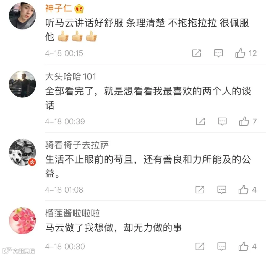 马云:做公益最大的完善,最受益的不是别人,而是自己。公益本身在于唤醒,公益和慈善最大的区别:慈善给的是钱,公益参与的是行动,公益在唤醒别人,慈善要低调,但公益要高调,公益不仅仅要善心,更要有善能,要有组织能力,要有结果导向,要有效率意识,要培养出一批人来。这次疫情过程中给阿里巴巴也好,给马云公益基金会很多年轻人很多的机会,未来我们想把马云公益基金会真正变成一个全球化的基金会,坚持在教育里面,坚持在企业家精神,坚持在女性领导者还有环境。像类似于(新冠肺炎疫情)这样的事情希望它发生得越少越好,但是一旦发生我们反应也是非常快的。