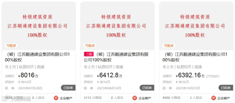 南通知名建筑公司江苏顺通建设集团有限公司100%股权被成功拍卖。