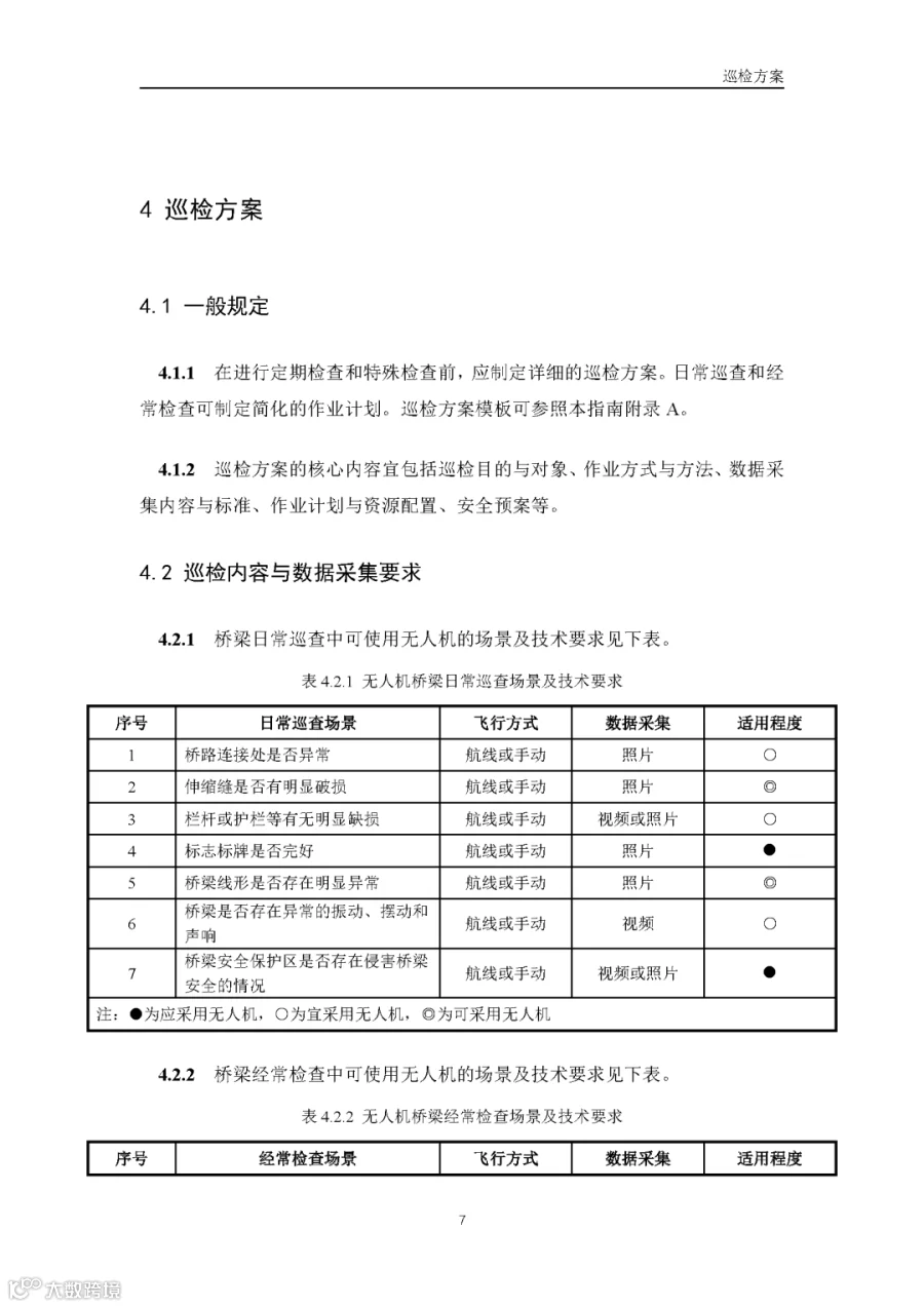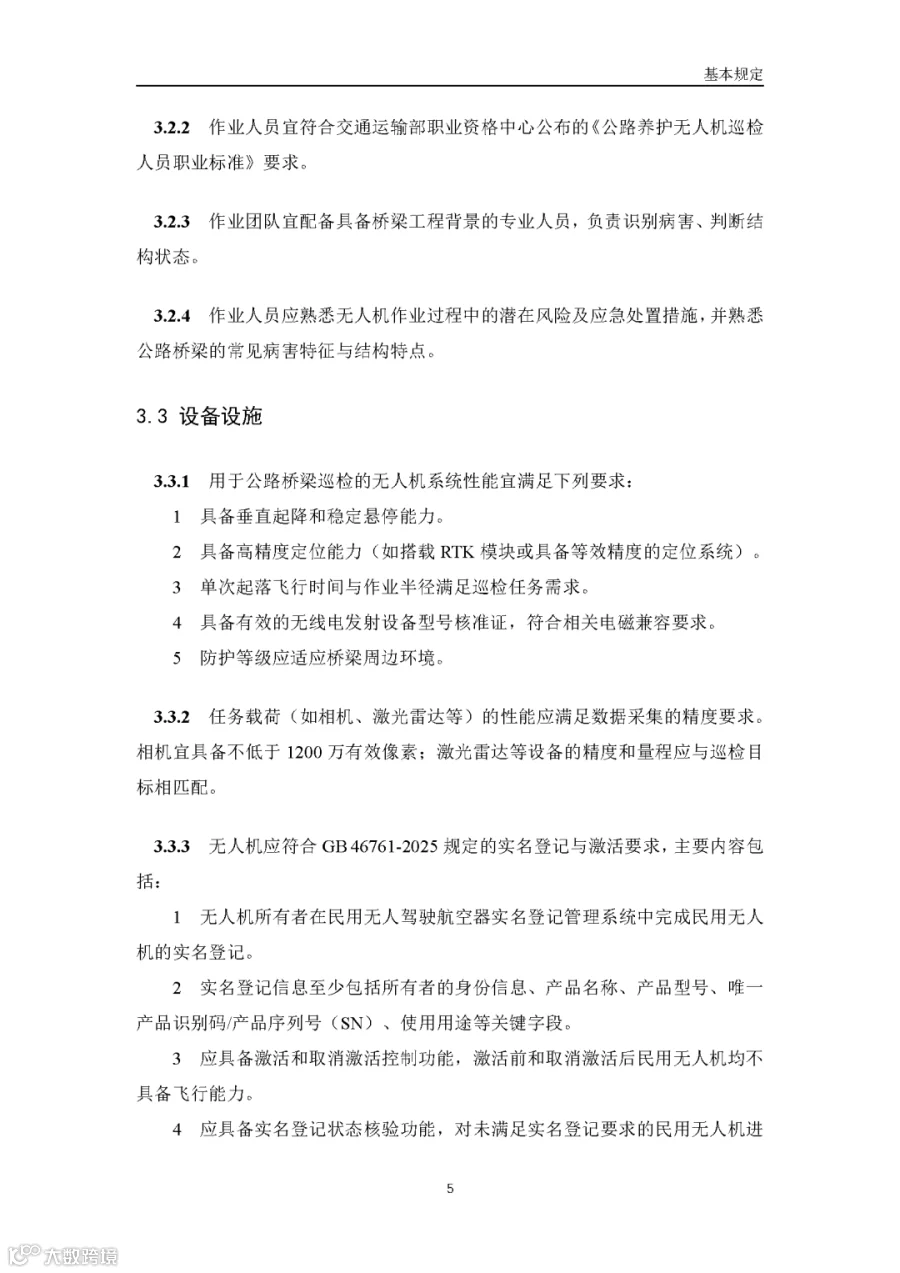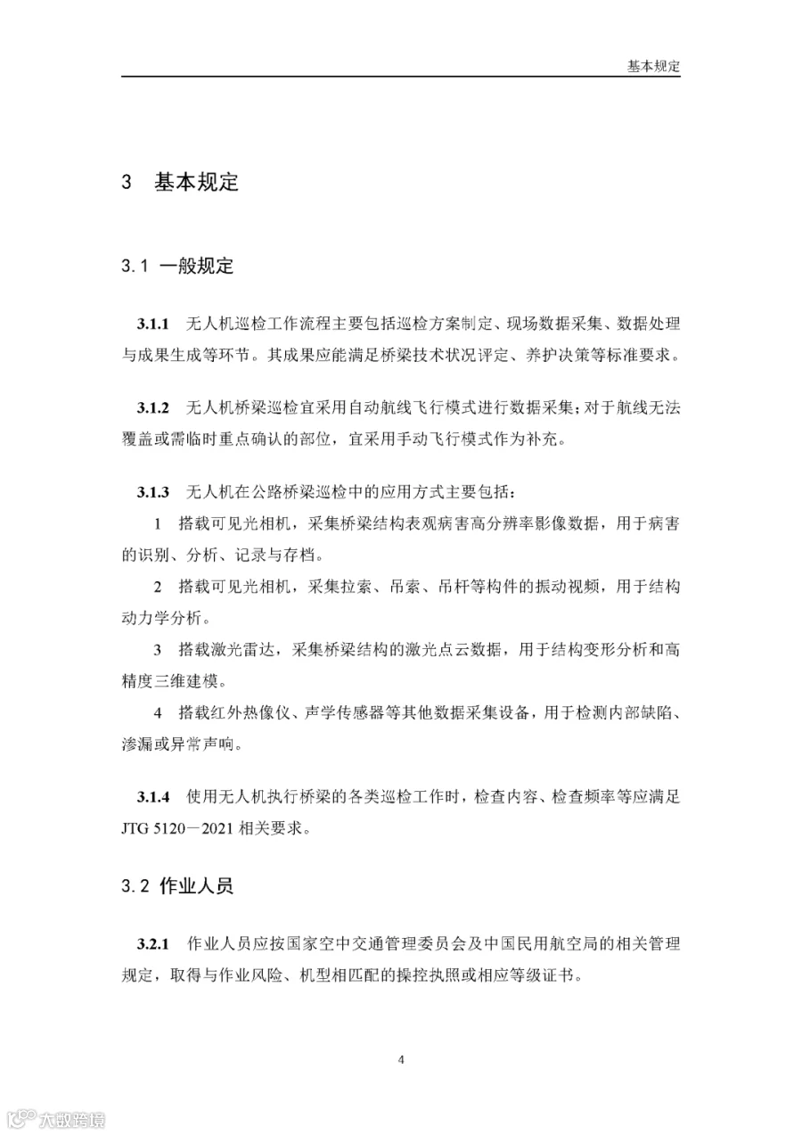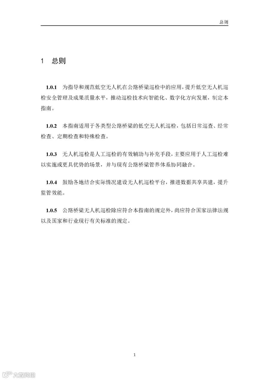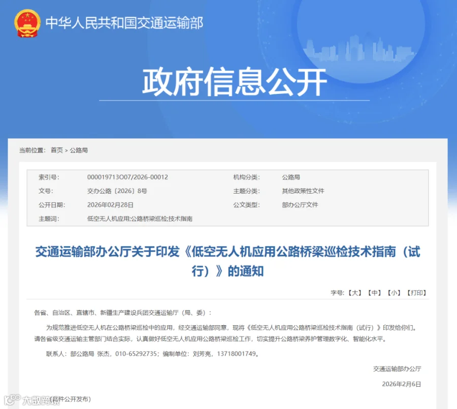 据通航圈了解,这部《低空无人机应用公路桥梁巡检技术指南(试行)》适用于各类型公路桥梁的低空无人机巡检,包括日常巡查、经常检查、定期检查和特殊检查。《指南》指出,无人机巡检是人工巡检的有效辅助与补充手段,主要应用于人工巡检难以实施或更具优势的场景,并与现有公路桥梁管养体系协同融合。 《指南》鼓励各地结合实际情况建设无人机巡检平台,推进数据共享共建,提升监管效能。