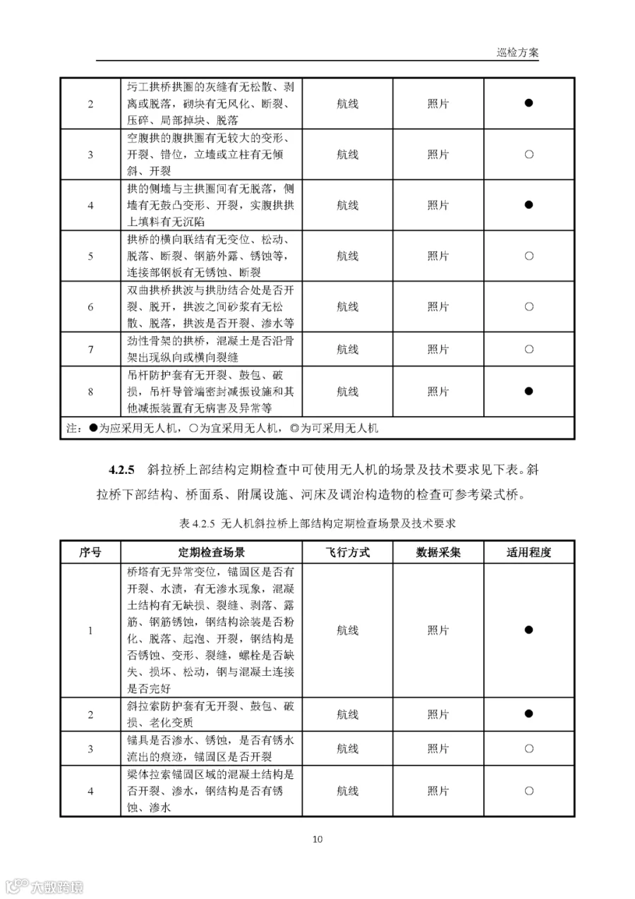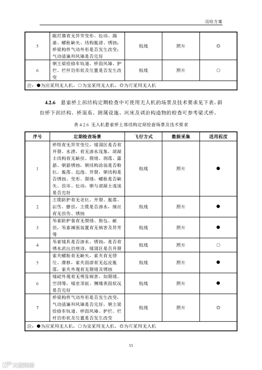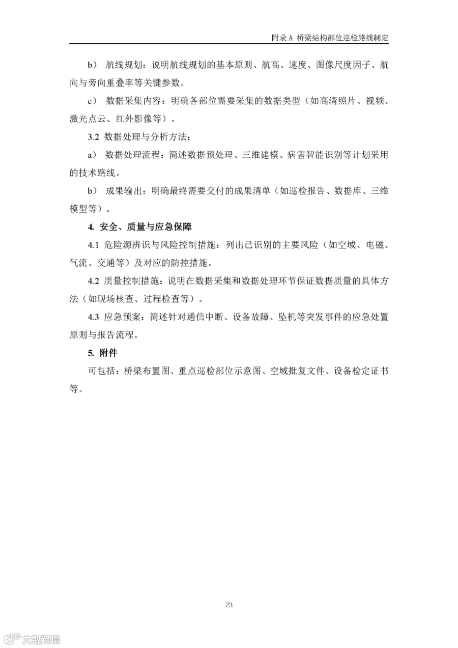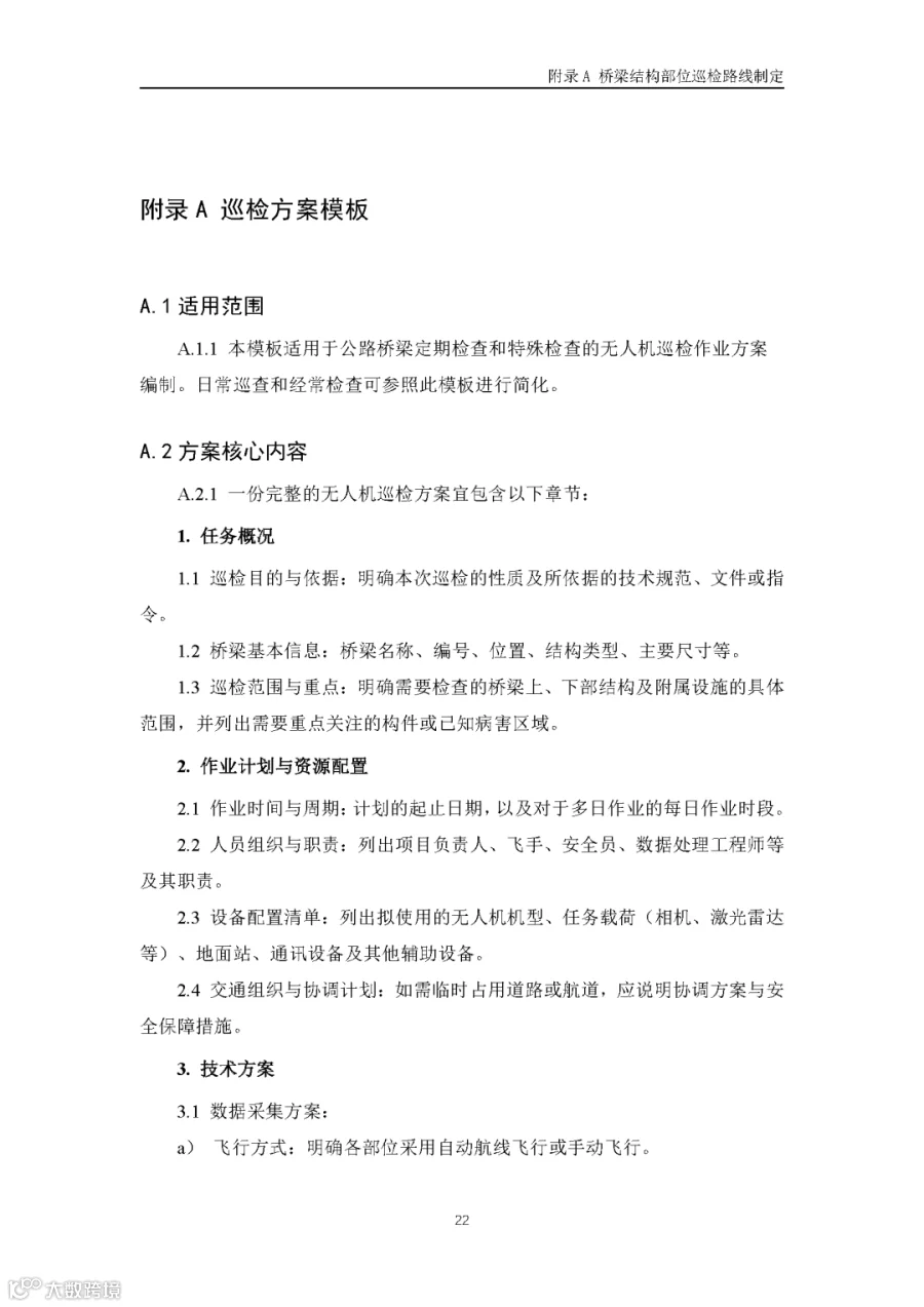 据通航圈了解,这部《低空无人机应用公路桥梁巡检技术指南(试行)》适用于各类型公路桥梁的低空无人机巡检,包括日常巡查、经常检查、定期检查和特殊检查。《指南》指出,无人机巡检是人工巡检的有效辅助与补充手段,主要应用于人工巡检难以实施或更具优势的场景,并与现有公路桥梁管养体系协同融合。 《指南》鼓励各地结合实际情况建设无人机巡检平台,推进数据共享共建,提升监管效能。