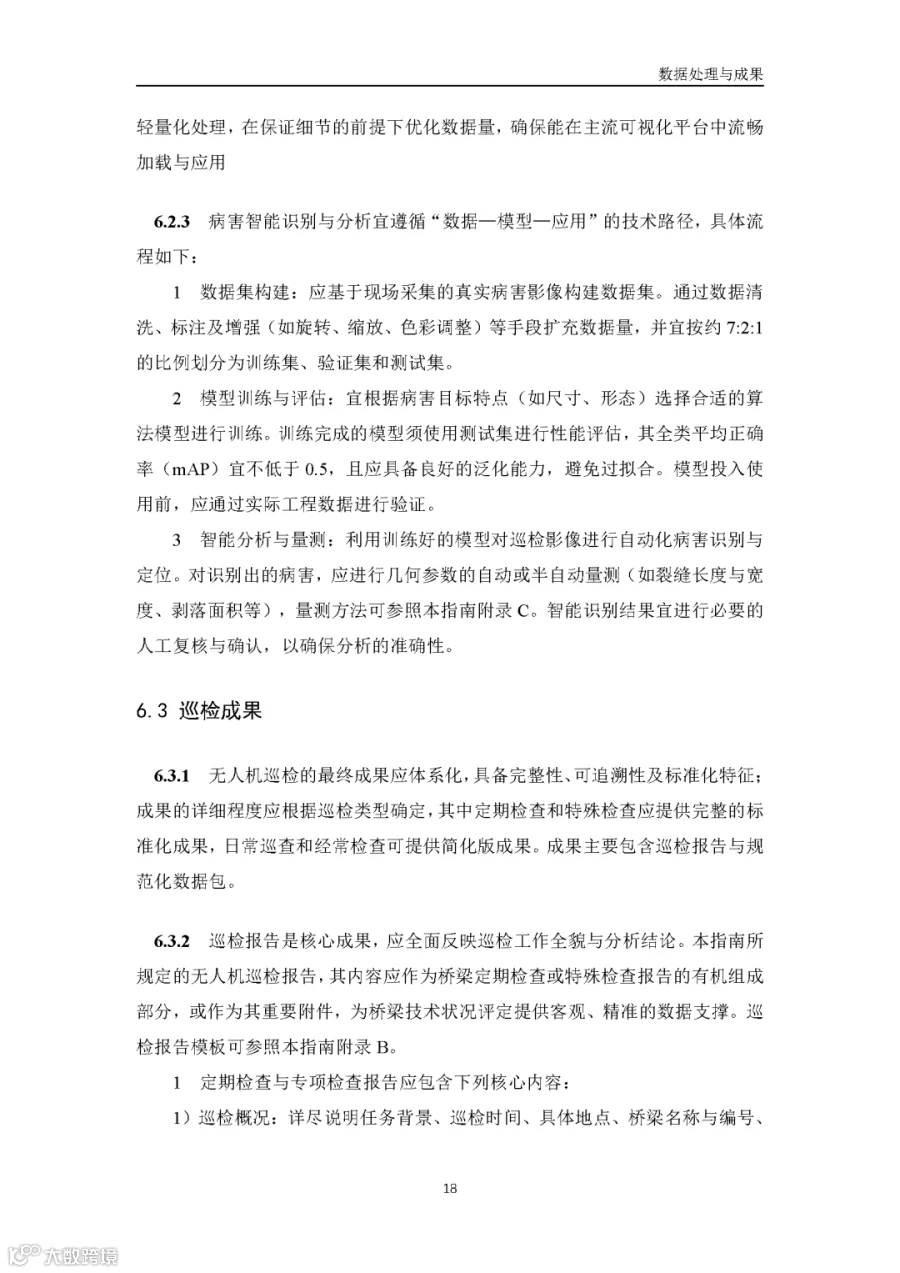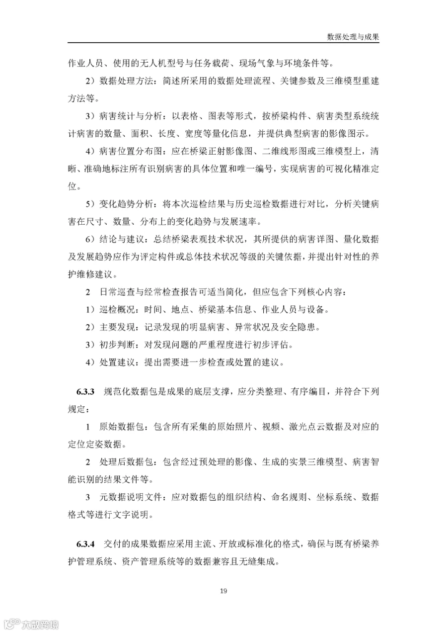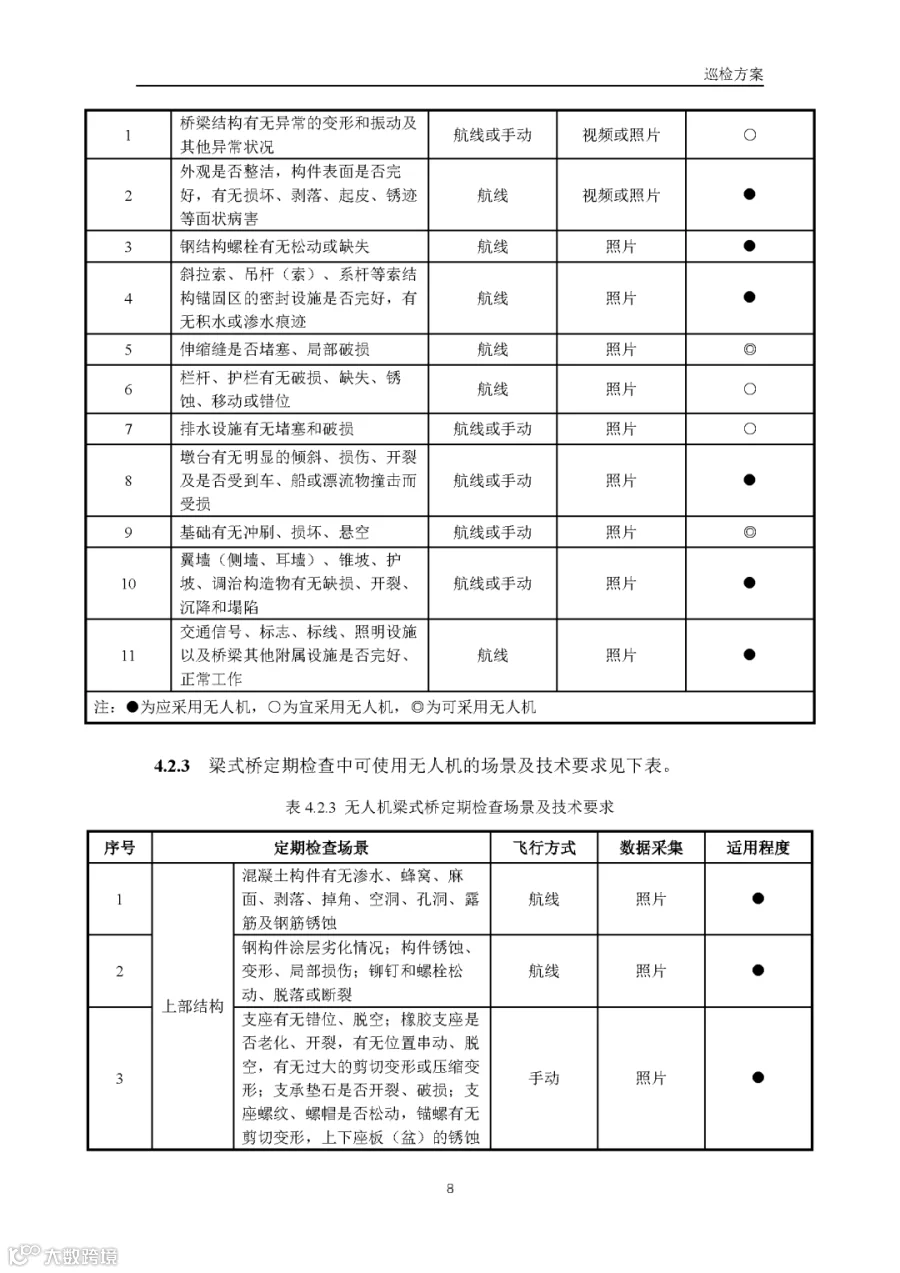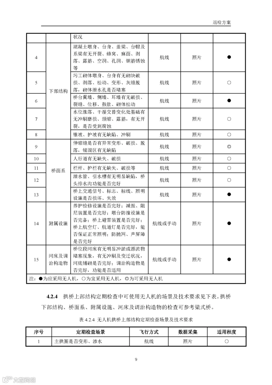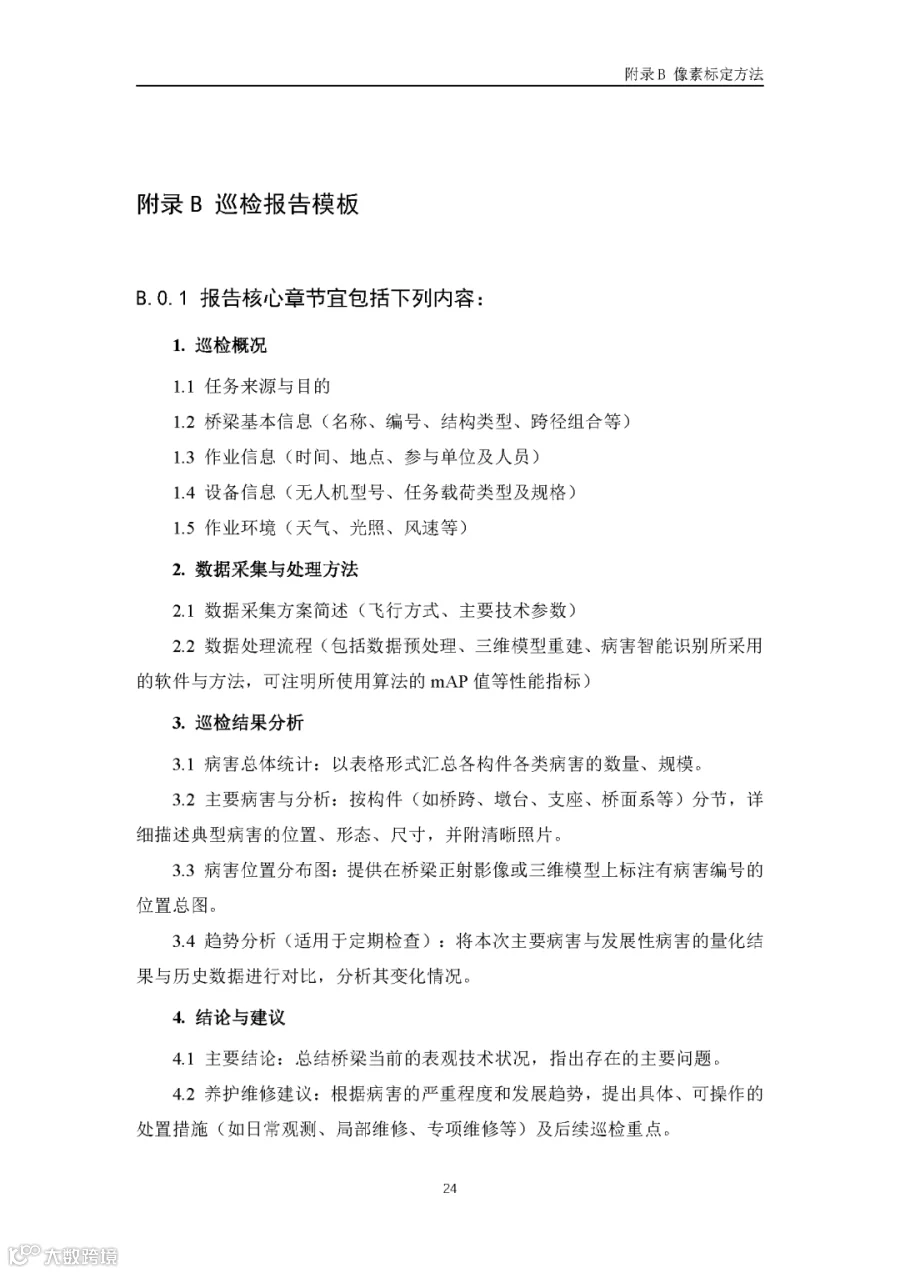 据通航圈了解,这部《低空无人机应用公路桥梁巡检技术指南(试行)》适用于各类型公路桥梁的低空无人机巡检,包括日常巡查、经常检查、定期检查和特殊检查。《指南》指出,无人机巡检是人工巡检的有效辅助与补充手段,主要应用于人工巡检难以实施或更具优势的场景,并与现有公路桥梁管养体系协同融合。 《指南》鼓励各地结合实际情况建设无人机巡检平台,推进数据共享共建,提升监管效能。