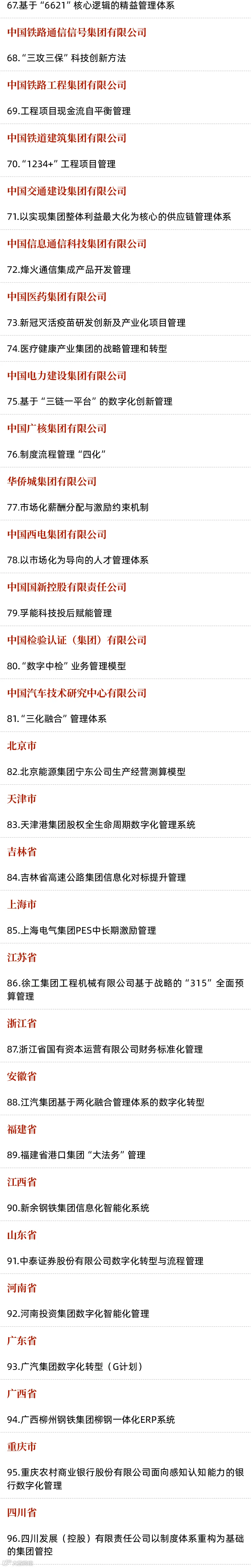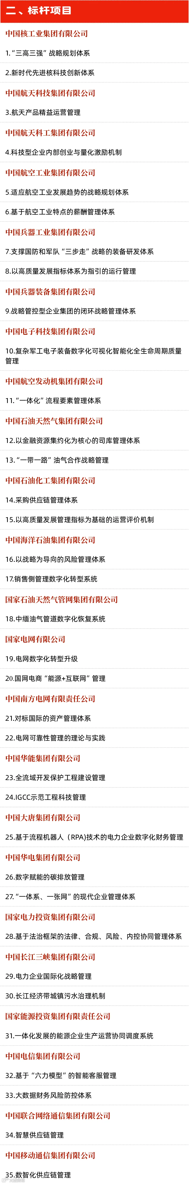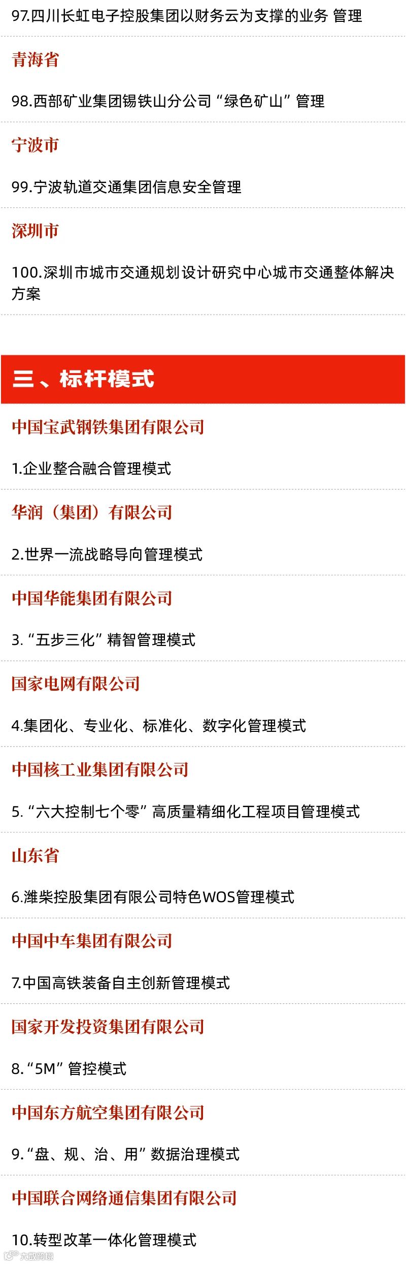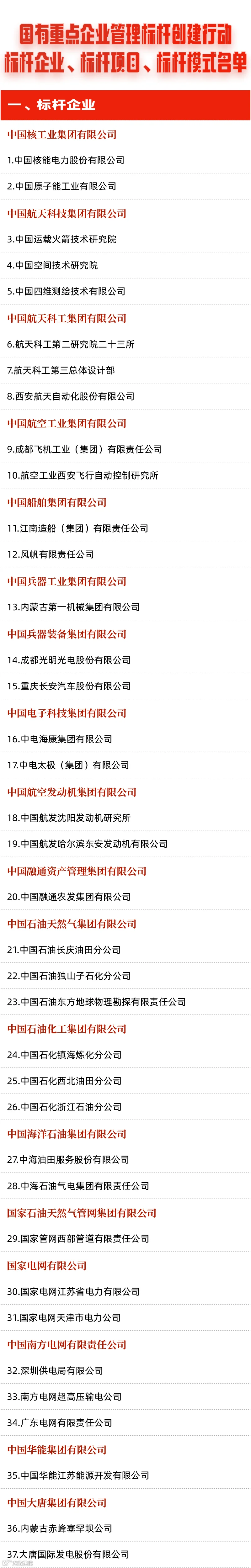 日前,国务院国资委组织开展国有重点企业管理标杆创建行动,公布了管理标杆企业、标杆项目和标杆模式(以下简称“三个标杆”)名单,促进国有企业不断强化管理体系和管理能力建设, 推动与世界一流对标、加快向世界一流迈进。管理标杆创建行动历经企业申报、专家评审、征求意见等环节,最终确定的“三个标杆”包含200家标杆企业、100个标杆项目和10个标杆模式。文末有具体名单。
