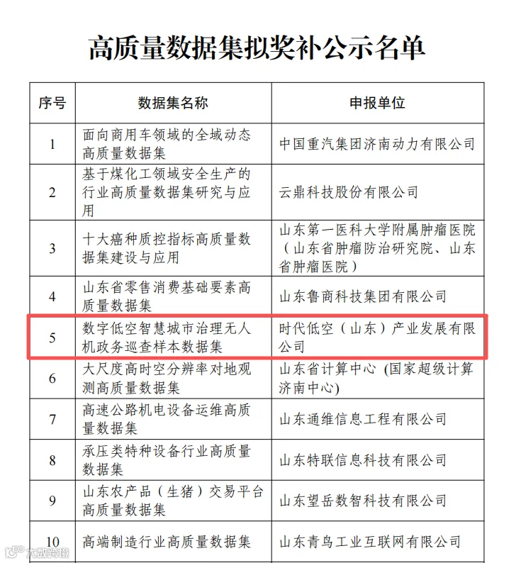 近日,山东省大数据局公布2026年度山东省“数据要素×”创新应用项目奖补对象名单,时代低空(山东)产业发展有限公司申报的“数字低空智慧城市治理无人机政务巡查样本数据集”成功入选。