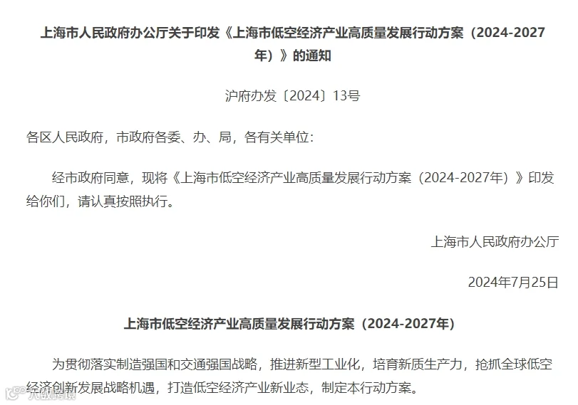 上海在今年8月发布《上海市低空经济产业高质量发展行动方案(2024—2027年)》,提出到2027年上海建立低空新型航空器研发设计、总装制造、适航检测、商业应用的完整产业体系,打造低空经济产业创新高地、商业应用高地和运营服务高地,核心产业规模达到500亿元以上,在全球低空经济创新发展中走在前列。此外还提出在金山区推动建设无人机试验区和机场等设施,部署无人驾驶航空器交通管理信息系统试点。多项政策推动了无人机在各个领域中的应用。