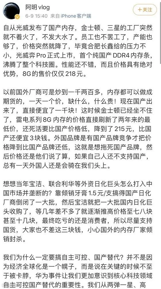 以前国外厂商可是炒到一千两百多,内存都可以做成期货的,一天一个价,缺什么,什么贵!现在国产出来了,直接便宜了一千块!这时候金士顿已经坐不住了,雷电系列8G 内存的价格直接刷新了两年来的最低价,还死活要比国产价格低,降到了215元,比国产还便宜3块钱。外国品牌是有国产品牌竞争才把价格降到比国产品牌还低,这就是想拖死国产品牌,然后价格还是他们说了算,如果自己人还不支持国产,总有一天外国人还是会骑在我们头上。