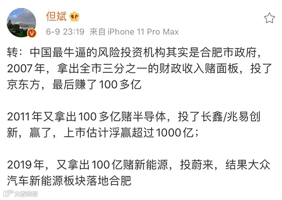 私募大佬在微博转了一条段子,是这么说的:转:中国最牛逼的风险投资机构其实是合肥市政府,2007年,拿出全市三分之一的财政收入赌面板,投了京东方,最后赚了100多亿
