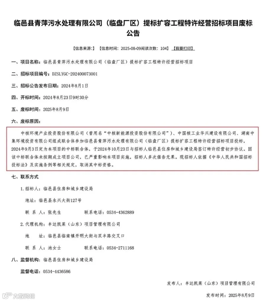 公告显示,中核环境产业投资股份有限公司(曾用名“中核新能源投资股份有限公司”)、中国核工业华兴建设有限公司、湖南中集环境投资有限公司组成联合体参加临邑县青萍污水处理有限公司(临盘厂区)提标扩容工程特许经营招标项目投标,2024年9月3日定为本项目的中标联合体,于2024年10月23日与招标人临邑县住房和城乡建设局签订特许经营初步协议。