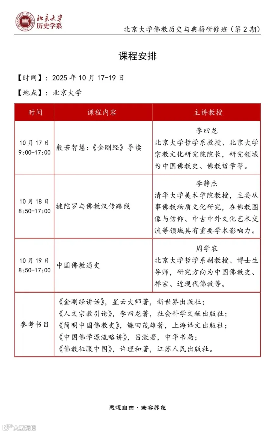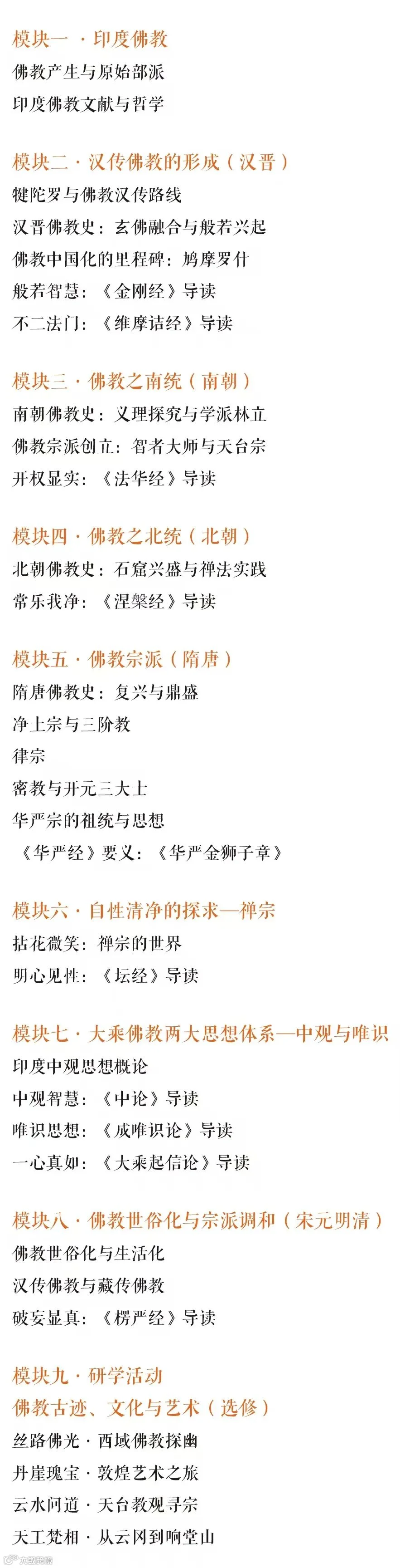 课程体系严谨,注重在佛教发展历程中观察思想演变:佛教自两汉之际传入中国,先依附于神仙方术,魏晋时期又依附于玄学而得以缓慢发展。东晋以后的长期战乱使得佛教在中国有了广泛的传播,却与中国本土文化产生了激烈的矛盾、冲突和相互融合。隋唐时期,佛教中国化不断深入,形成了汉地特有的佛教宗派,从而进入三教并立的鼎盛时期。可以说不了解佛教历史就无法真正理解中国佛教。