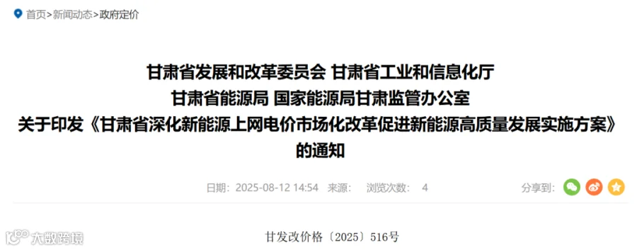 8月12日,甘肃发改委正式发布关于印发《甘肃省深化新能源上网电价市场化改革促进新能源高质量发展实施方案》的通知。