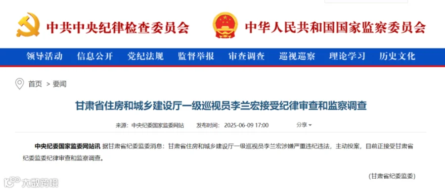 甘肃省纪委监委6月9日消息,甘肃省住房和城乡建设厅一级巡视员李兰宏涉嫌严重违纪违法,主动投案,目前正接受甘肃省纪委监委纪律审查和监察调查。