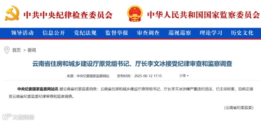 6月12日,云南省住房和城乡建设厅原党组书记、厅长李文冰主动投案接受调查;