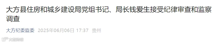 6月6日,贵州大方县住房和城乡建设局党组书记、局长钱爱生被查。