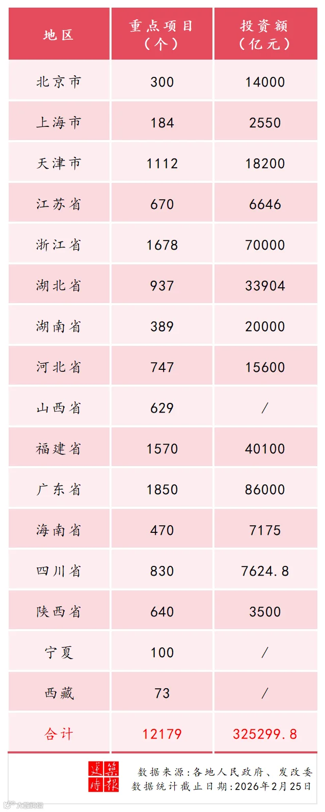 重大项目是经济发展的重要支点,也是高质量发展的关键抓手。经本报梳理统计,截至目前,全国已有16个地区发布2026年重点工程项目相关投资计划,重点项目合计超1.2万个,总投资额合计达325299.8亿元。