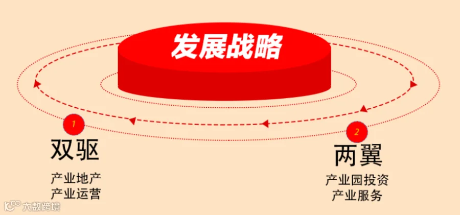 以“双驱”(产业地产与产业运营) + “两翼”(产业园投资与产业服务)的发展战略为核心,采用“轻重资产结合、服务与投资并举”的综合运营模式,实现资本与产业的深度融合,促进企业的快速成长和园区的持续发展。