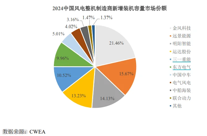 在风电行业持续发展的背景下,中国风电市场的行业集中度逐步提升。根据 CWEA,2024 年前五大风电整机制造商新增装机容量占总新增装机容量的 75.01%;前十大风电整机制造商新增装机容量占总新增装机容量的 98.63%。金 风科技、远景能源稳居前二,已经形成较大的领先优势。