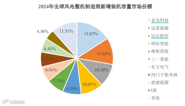 全球风电整机行业集中度较高。彭博新能源财经(BNEF)公布了 2024 年全 球风电整机制造商新增装机容量市场份额排名。2024 年风电整机新增装机容量 份额在全球市场占比最高的前五大风电整机制造商为金风科技、远景能源、运达 股份、明阳智能、维斯塔斯,总市场份额占比达到 56.50%;前十大风电整机制造 商新增装机容量的市场份额占比达到 88.49%。前十名中中国厂商占据 6 席,与 上一年持平。