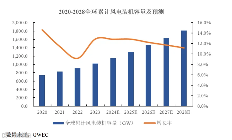 根据 GWEC 统计,2023 年全球风电新增装机量 116.6GW 中,陆上风电新增 装机量 105.8GW,海上风电新增装机量 10.8GW。根据 GWEC 的市场预测,2024- 2028 年,全球新增风电装机容量将保持 9.4%的复合增长率,平均每年新增风电 装机容量 158GW,五年间总新增风电装机将突破 791GW。全球累计风电装机将 于 2028 年末达到 1,813.6GW。