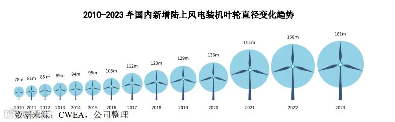 风电机组通过风电叶片采集风力资源,并带动发电机组旋转产生电流,从而 实现风能向电能的转化。风电叶片是风电机组中主要的组成部件,其叶片形状尺寸直接决定了风机机组的运行效率。随着最近几年,国内陆上风机、海上风机 逐渐大型化的趋势,风电叶片的叶轮直径也在不断增长,同时叶片的叶型、结构、 材料也在随之不断进行迭代和更新。从技术上看,风电叶片尺寸越大,可增大风 机的扫风面积,从而捕获更多的风能,提升风机机组的发电效率,同时增加机组 的竞争力,降低风电度电成本。风机叶片自问世以来,风机叶片的尺寸在不断提 升,2021-2023 年,风电叶片主流直径每年以 15 米左右的速度增长,截至 2023 年末陆上风电主流的叶轮直径已经达 181 米(单片叶片约 90 米长),极大地提升 了风机机组整体的发电效率。