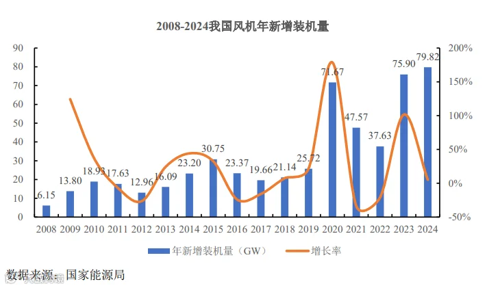 根据国家能源局及中国风能协会,2000 年,我国风电装机量仅为 0.3GW, 2002 年国产化机组实现批量化生产以来,我国风电年装机量开始呈现快速增长。 截至 2012 年末,我国风电累计装机量达 75.32GW,超越美国成为世界第一风电 大国;2020 年,我国风电新增装机容量达到 71.67GW,同比增长 178.70%,2021 和 2022 年我国风电新增装机容量虽相对 2020 年有所下降,但仍超过 2020 年之 前的各年度风电新增装机容量;2023 年我国风电新增装机容量为 75.90GW;2024年我国风电新增装机容量继续稳定增长,创历史新高,为 79.82Gw。