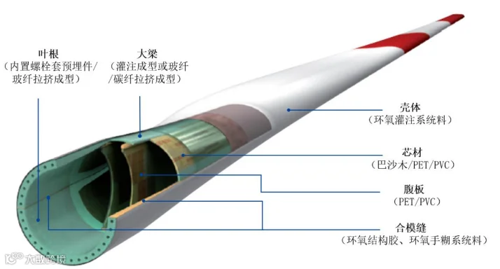 自风电产业诞生以来,人们便不断探索更高性能的风电叶片和机组材料。风 电叶片用材料经历了由木质叶片、金属叶片到复合材料叶片的过程。目前,行业 普遍采用高分子聚合物,如环氧树脂、不饱和树脂等,通过与玻璃纤维或碳纤维 的复合灌注固化来制造风电机组叶片。相较于木质叶片和金属叶片,复合材料风 电叶片具有质量轻、比强度高、刚性好、成型工艺简单、抗震性好、抗疲劳性能 好、耐腐蚀性和耐气候性好、易于修补等优势,因此成为当前风电叶片的主流选 材。