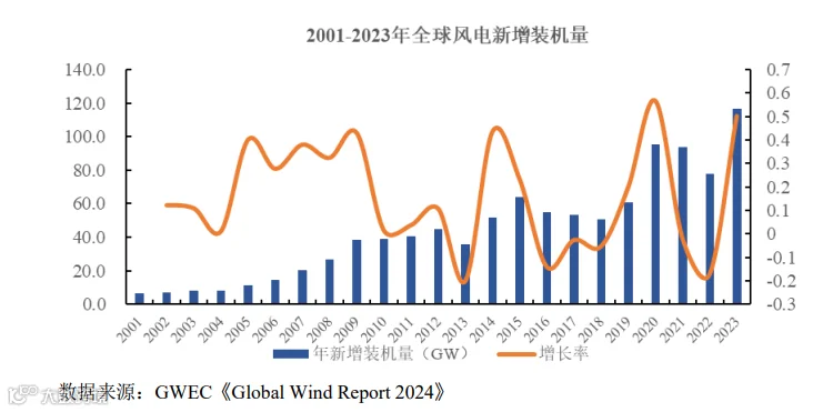 风电是清洁能源和新能源中的重要的组成部分。21 世纪以来,在全球气候 变暖和减少碳排放的大背景下,全球风电行业总体快速发展。根据 GWEC,2020 年全球风电新增装机量创造历史新高 95.3GW,较 2019 年同比增长 56.74%,2021 年全球风电新增装机量略微降低,但仍有 93.6GW,连续两年全球风电新增装机 量突破 90GW,2022 年新增装机数 77.6GW,2023 年新增装机数 116.6GW,2015- 2023 年全球风电新增装机量年复合增长率达 7.83%。