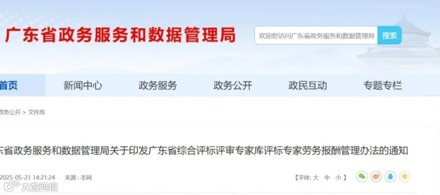 近日,广东省政务服务和数据管理局发布《关于印发广东省综合评标评审专家库评标专家劳务报酬管理办法的通知》,自2025年7月1日起施行,有效期5年。