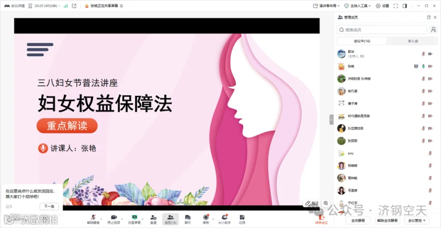 3月6日上午,活动的另一重头戏——线上普法讲座准时开启。律师张艳围绕劳动权益保障、婚姻家庭纠纷处理等常见法律问题,结合实例讲解法律知识。大家纷纷表示,讲座干货满满,提升了妇女权益的法律知识,以后会积极运用法律武器维护自身权益。